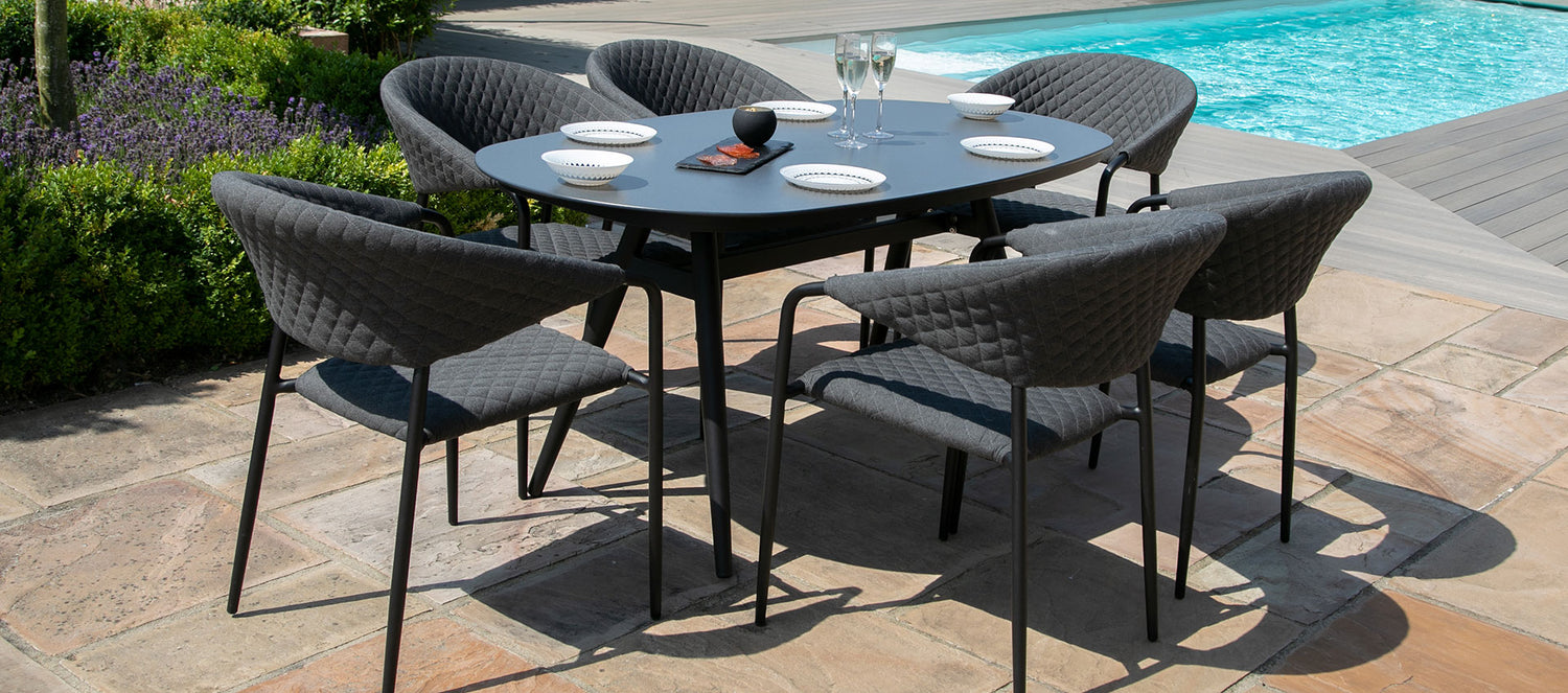 Practical and stunning this large oval dining set could make a feature in any garden space. Designed for patio areas presenting a place to spend your summer afternoons in comfort. Available in a large range of colours working with other out door furniture is effortless.